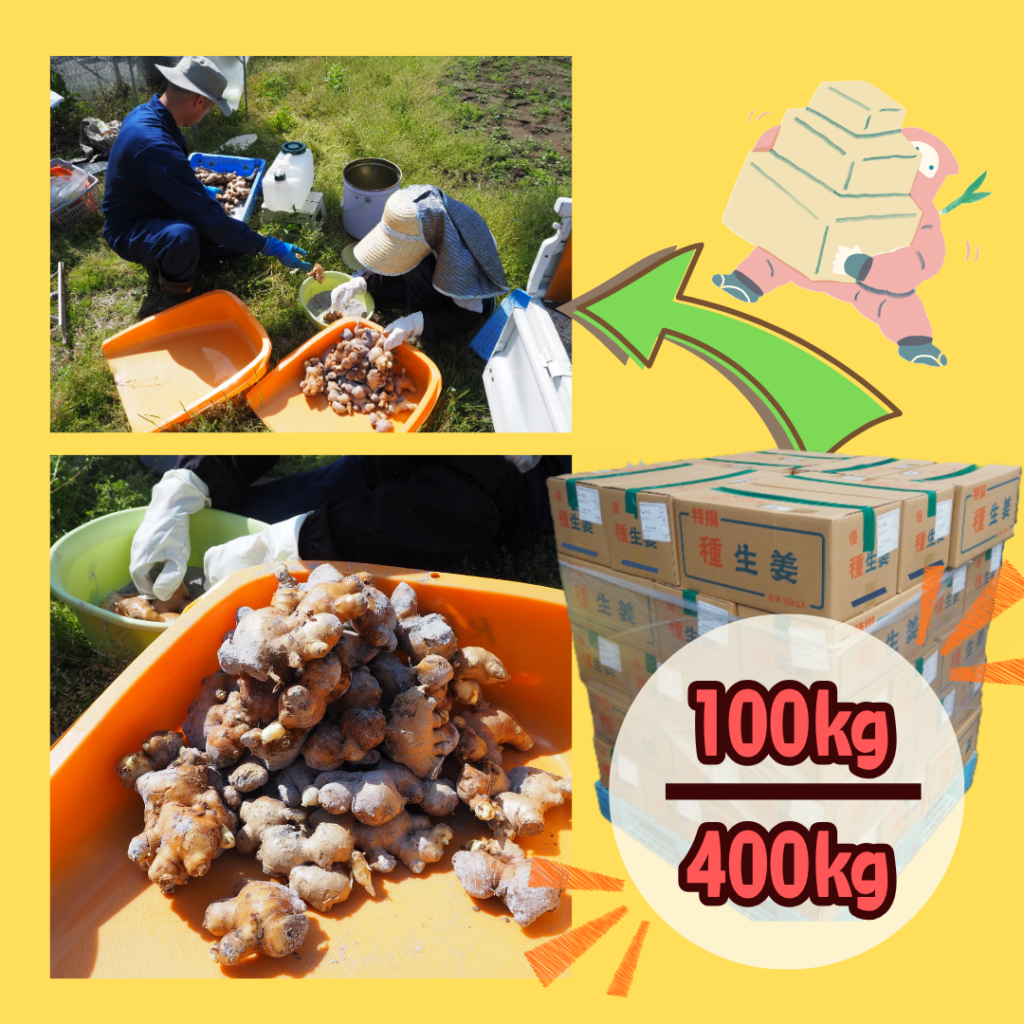 今年は、合計400㎏の種生姜を仕入れ、そのうち100㎏を自社のR FARMの畑に